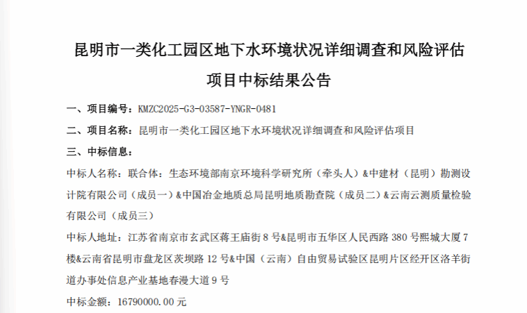 1月20日,在地质环境院的努力下,中建材昆勘院依托在地下水环保领域的深厚技术积累,作为核心成员联合中标“昆明市一类化工园区地下水环境状况详细调查和风险评估项目”,中标金额1679万元,实现2026年环保业绩“开门红”。