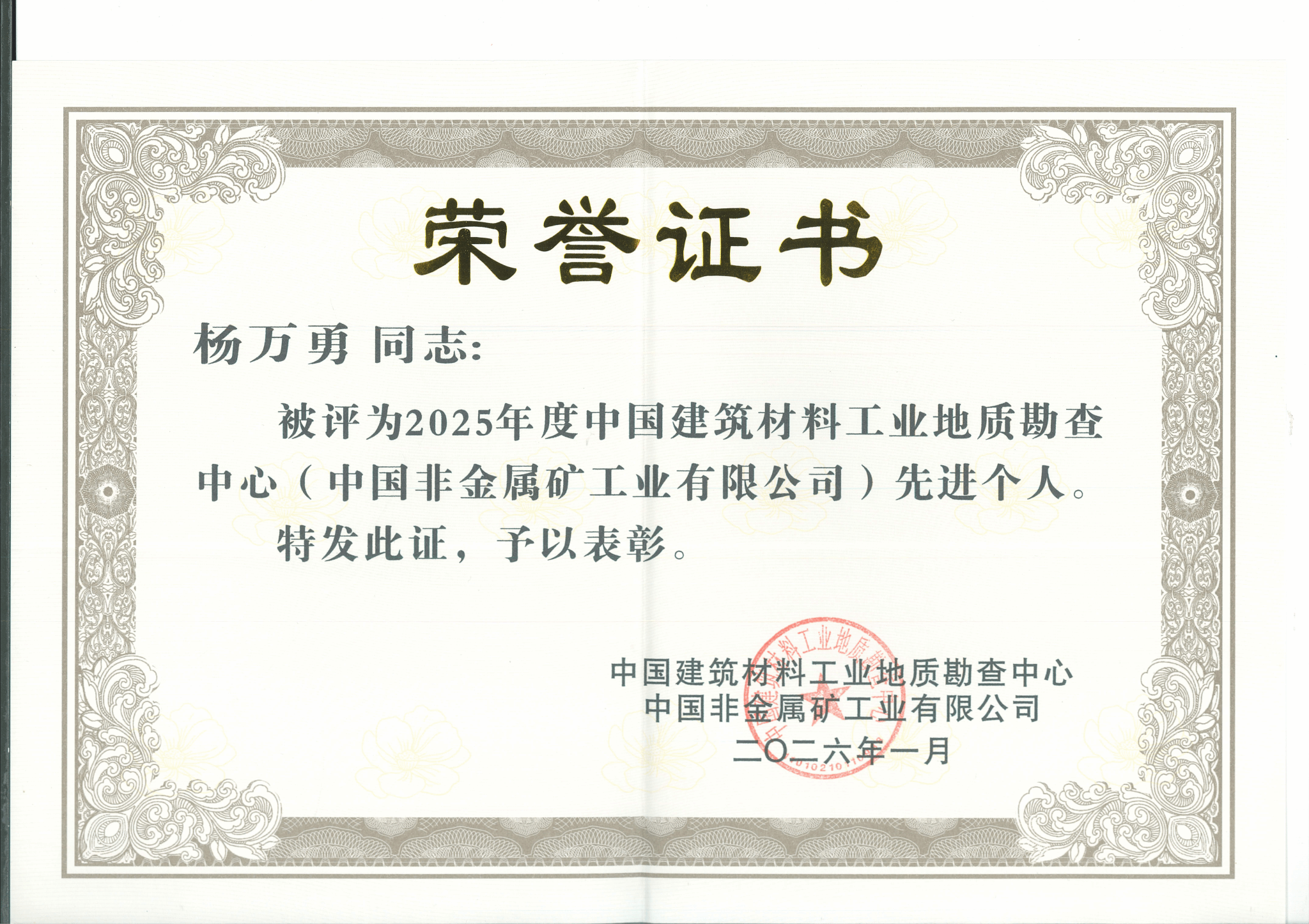 1月5日,中国建筑材料工业地质勘查中心(中国非矿)下发《关于表彰2025年度先进集体和先进个人的决定》,我队杨万勇荣获“2025年度先进个人”荣誉称号。
