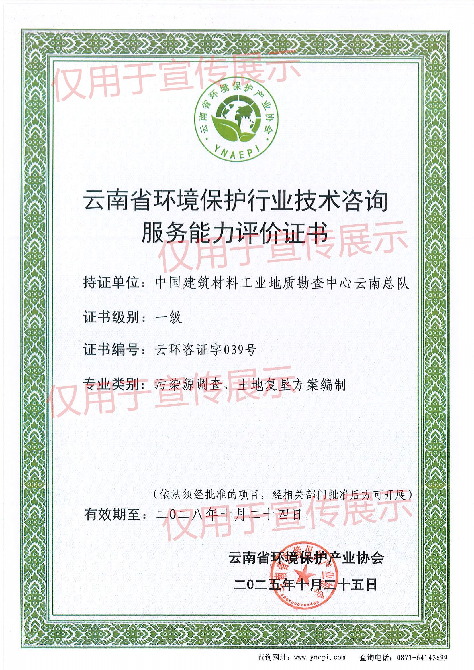 继云南总队2022年取得云南省环境保护行业技术咨询服务能力评价污染源调查一级证书后,今年10月25日,该证书的土地复垦方案编制一级增项又成功获批。此次增项成功,进一步增强了总队的市场竞争能力,展现了我队在环保领域发展的良好势态,为进一步拓展环保业务打下了良好基础,对扩大合作机会、优化品牌建设起到了积极的推动作用。未来,云南总队将继续构建更完善的资质体系,为相关业务发展提供更强有力的支撑!